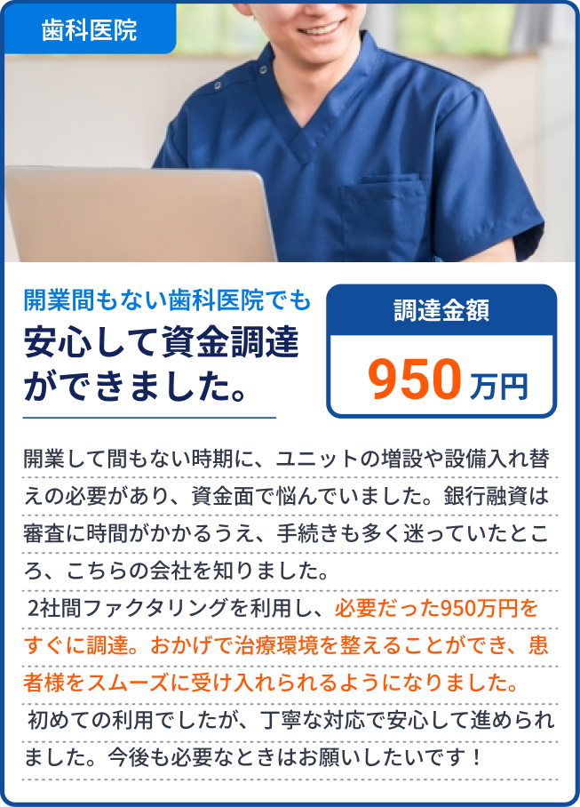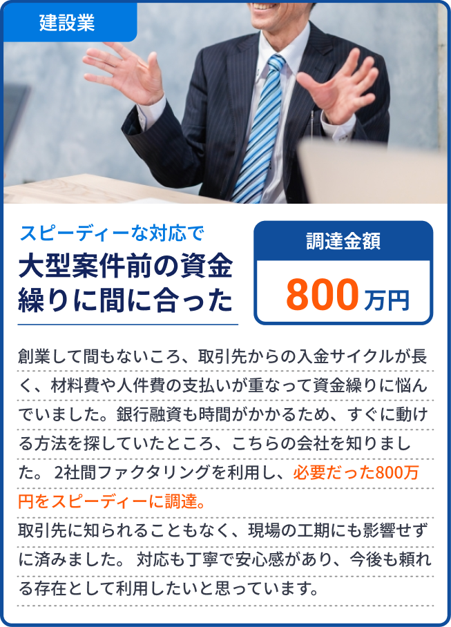 基本的には、売掛先1社あたりの買取上限は1億円までとなっております。ただし、売掛先の企業規模や取引の継続年数などを総合的に判断し、上限を超える金額にも対応可能な場合がございます。まずはお気軽にご相談ください。