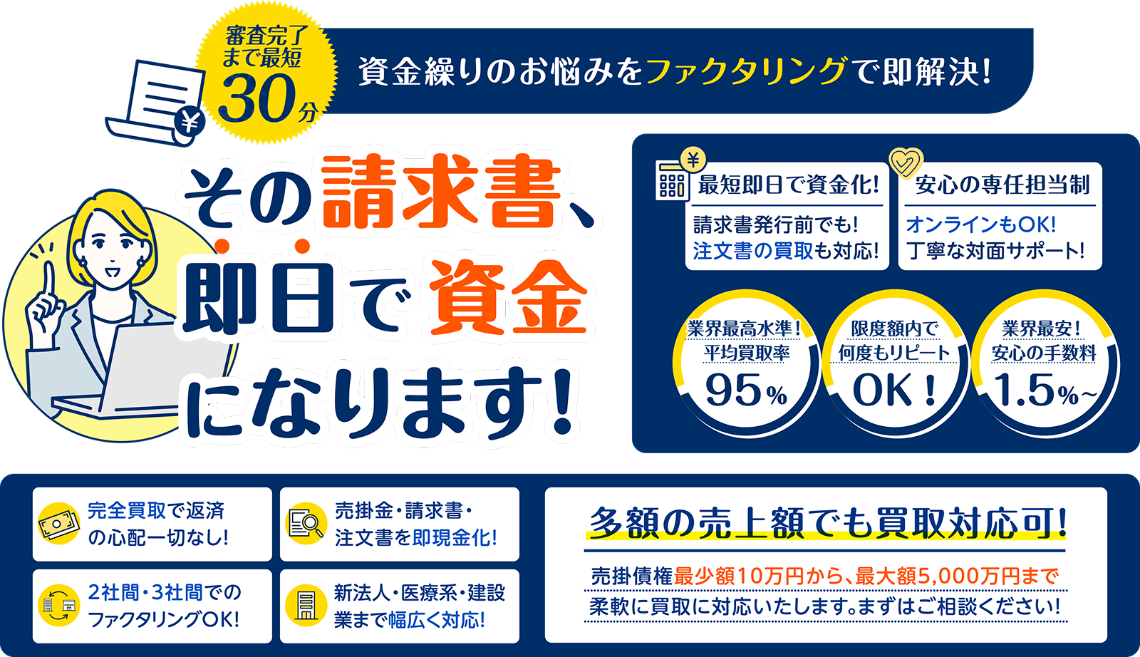 ご利用は、売掛債権の請求額が30万円以上から可能となっております。