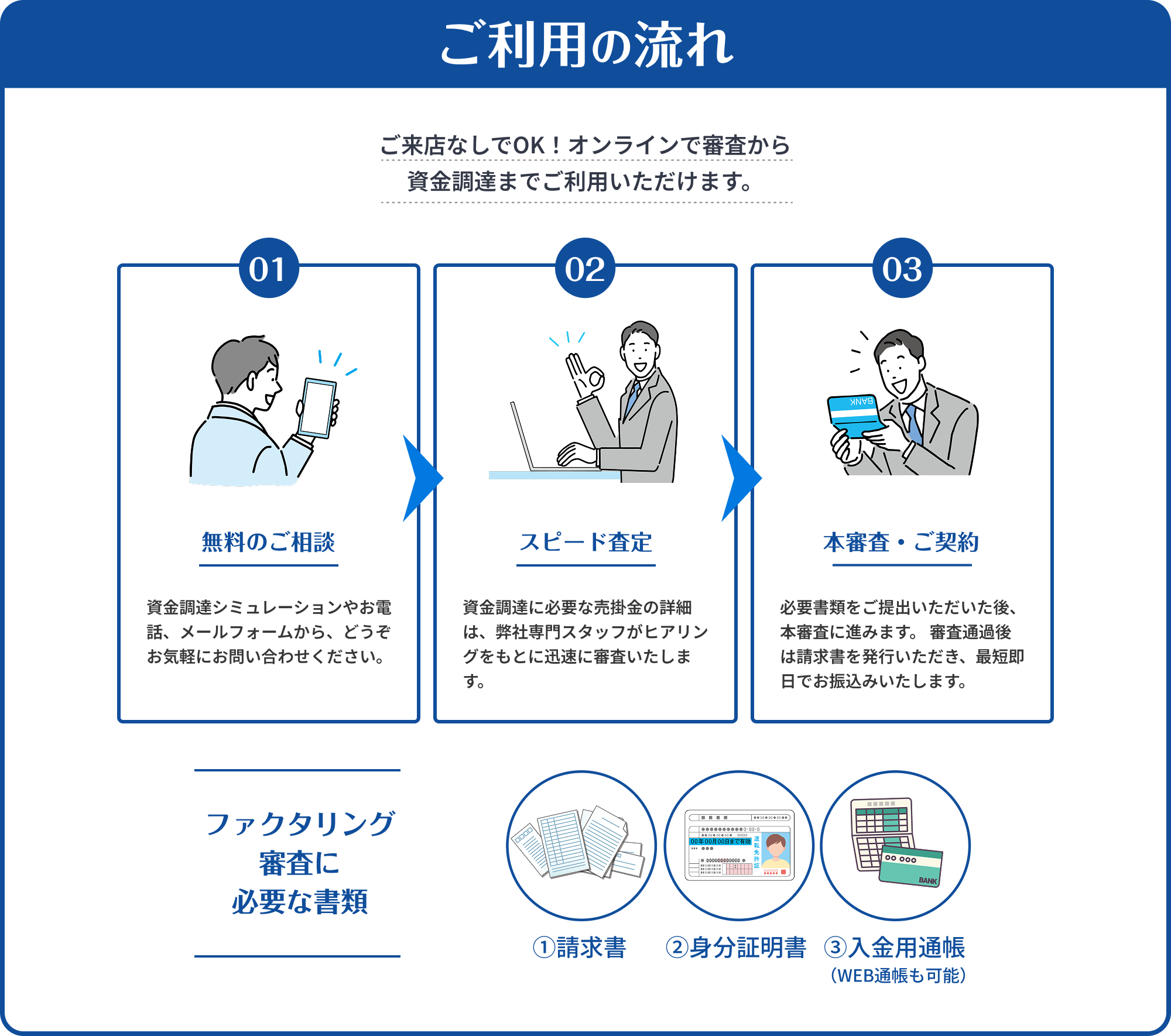 審査の際にはご来店の必要はありませんが、ご契約時には面談をお願いしております。ご来社いただくか、遠方にお住まいの事業者様にはこちらからお伺いすることも可能です。