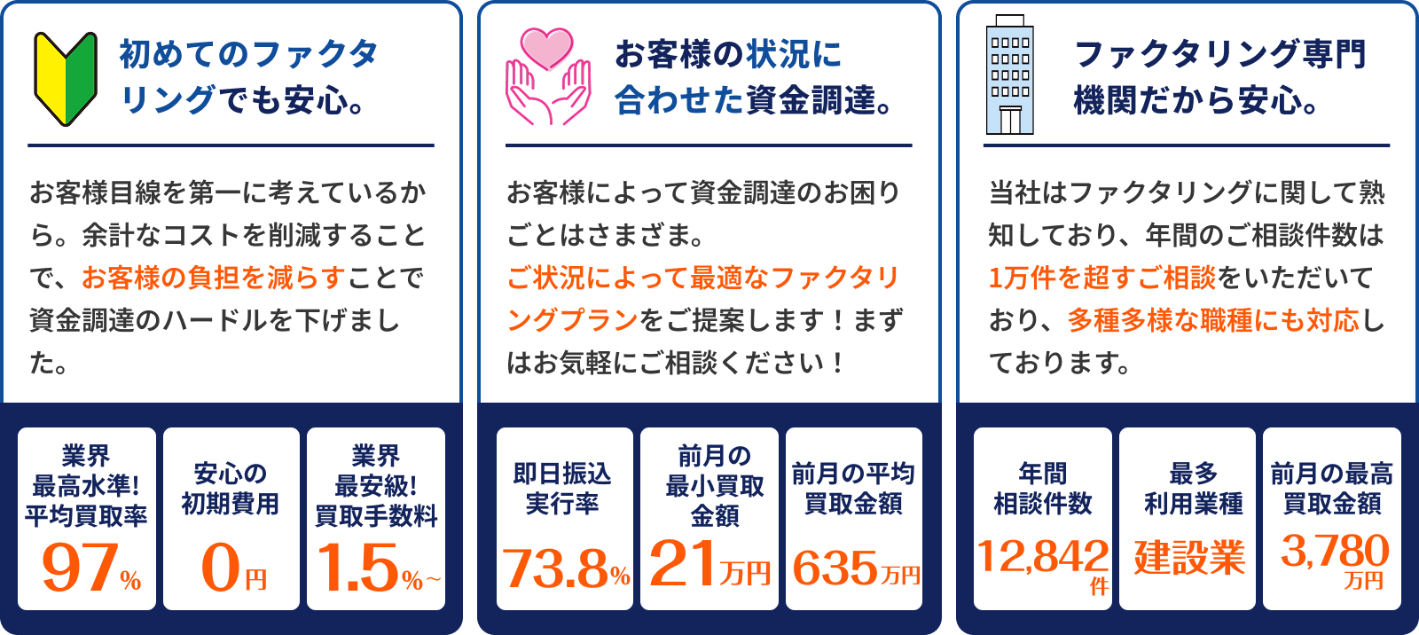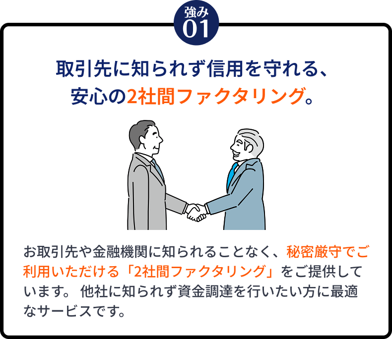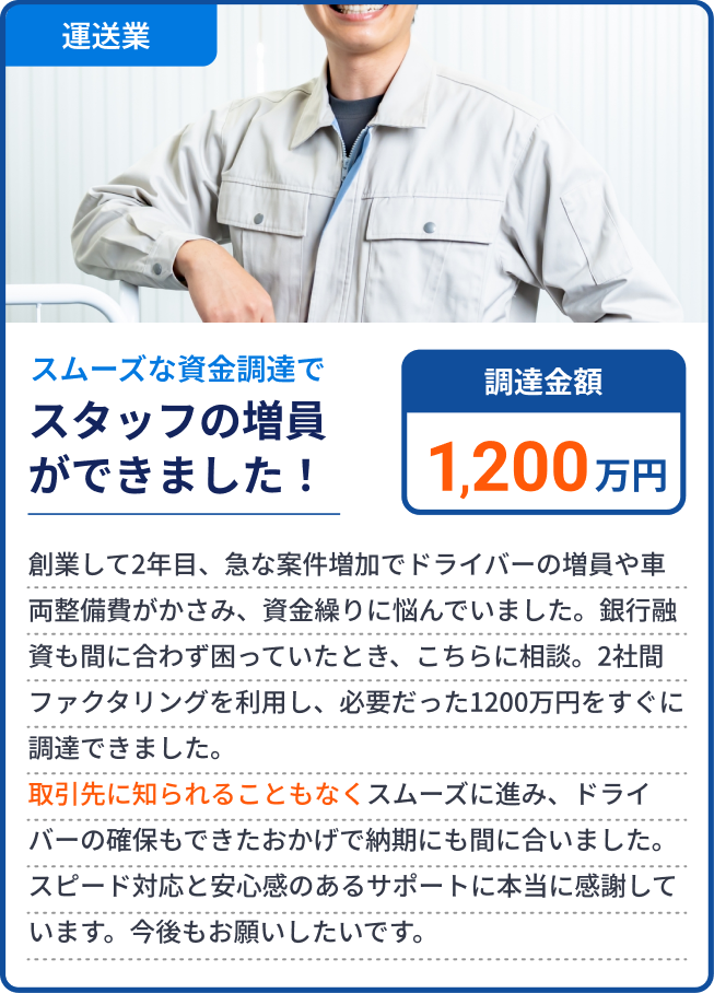 基本的には、売掛先1社あたりの買取上限は1億円までとなっております。ただし、売掛先の企業規模や取引の継続年数などを総合的に判断し、上限を超える金額にも対応可能な場合がございます。まずはお気軽にご相談ください。