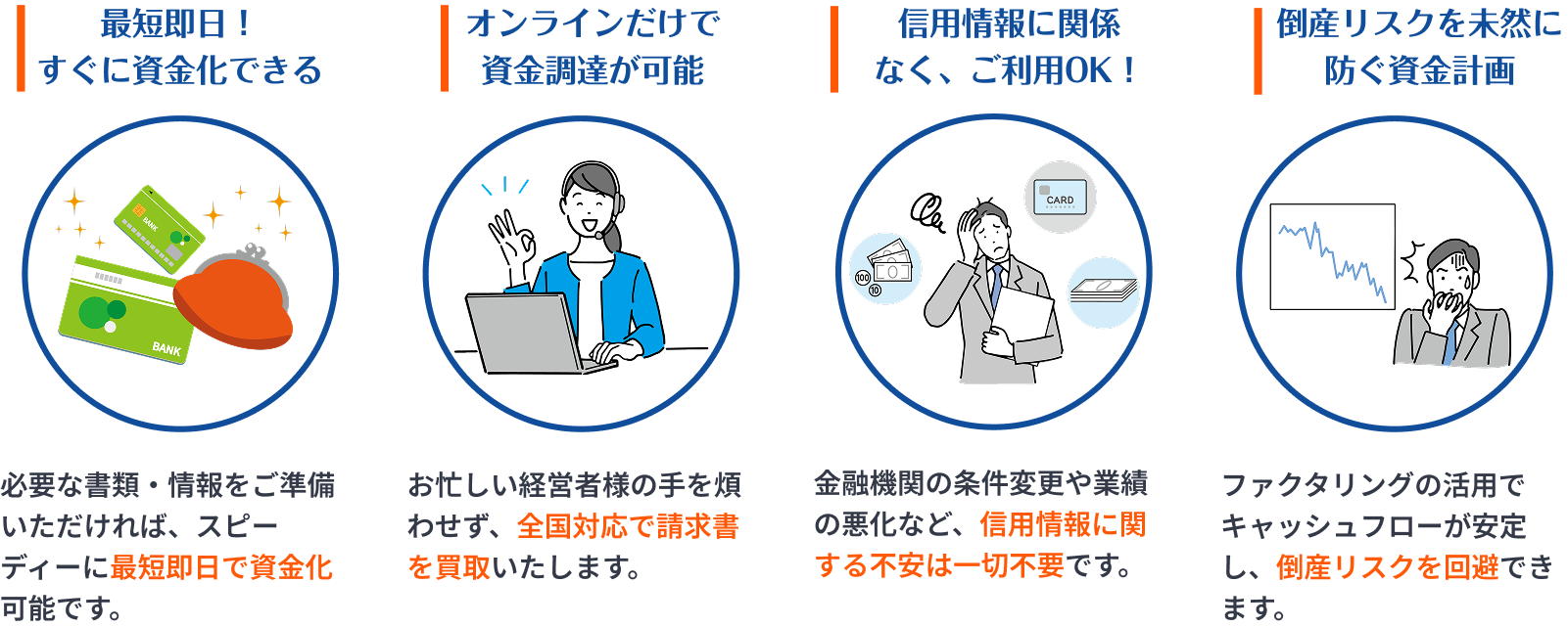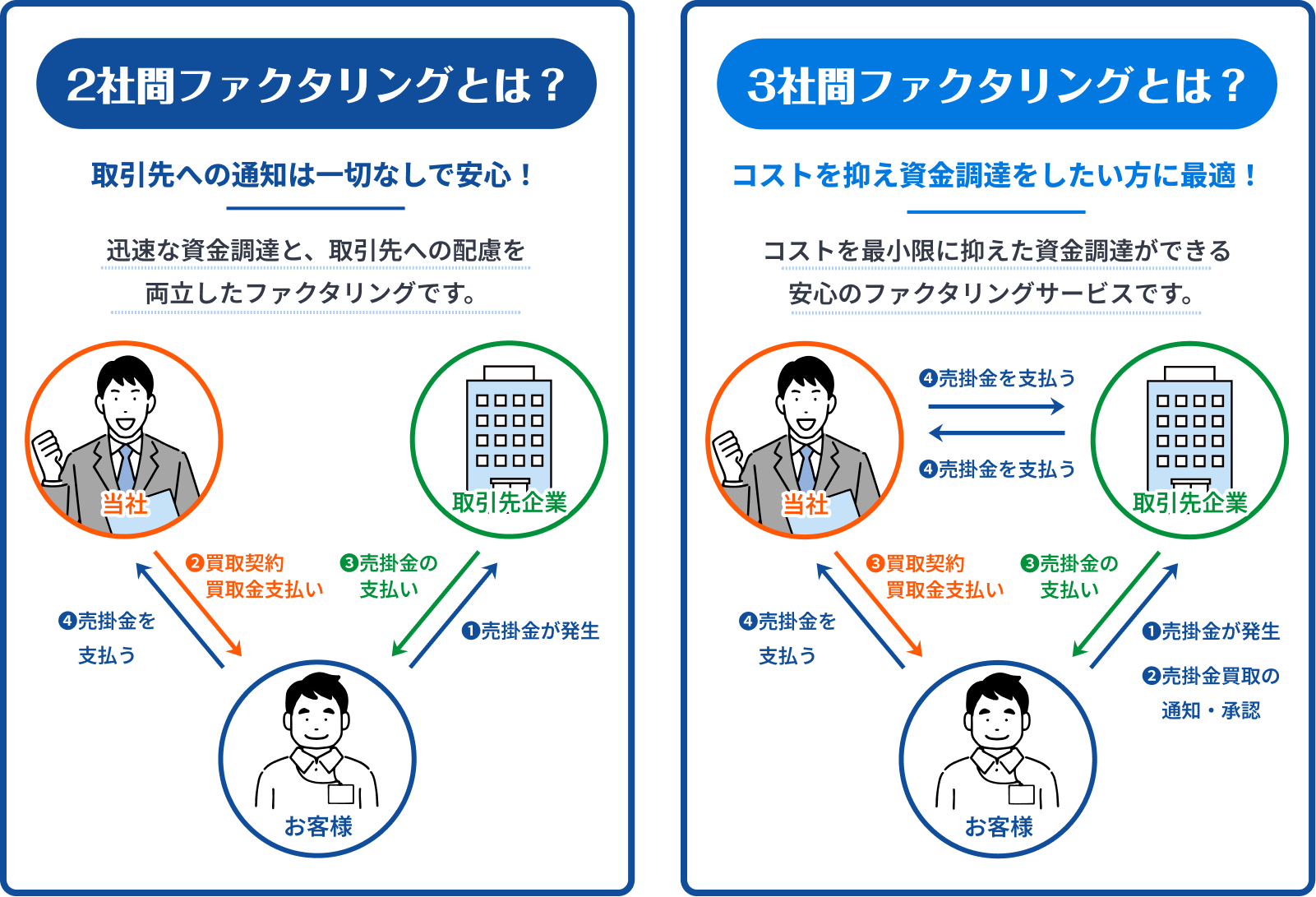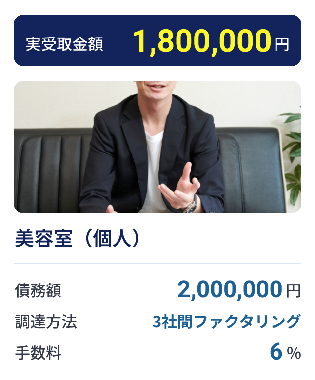 基本的には、個人事業主の方から法人の方まで、どなたでもご利用いただけます。ファクタリングでは、申込者ご本人の信用や法人格よりも、売掛債権の信頼性が重視されます。そのため、審査においては取引先企業の信用状況や企業規模などが判断材料となる場合があります。