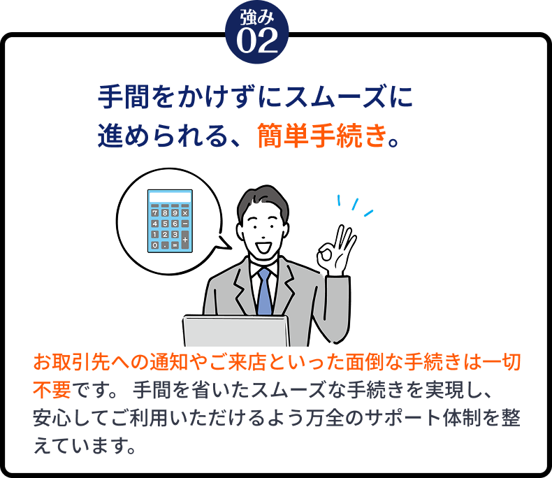 登記を行わずにご利用いただくことも可能です。債権譲渡登記を行わないファクタリングにも対応しておりますので、ご希望の方はお気軽にご相談ください。