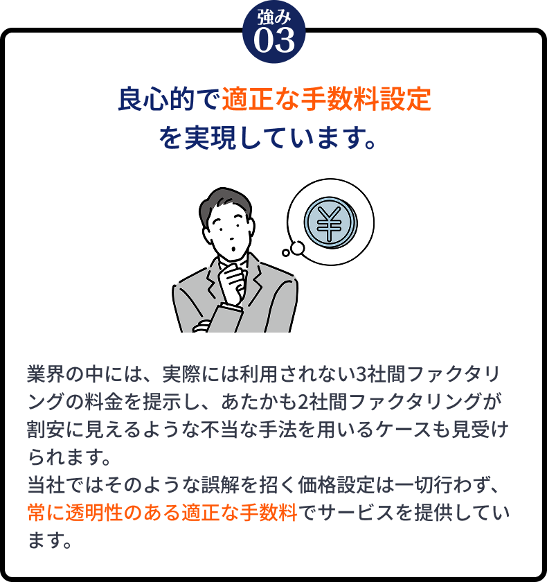 手数料は、債権の種類や売掛先の信用状況、支払期日や償還期間などに応じて異なりますが、資金調達コンシェル®では2社間ファクタリングにおいて業界最安水準の「1.5%~」でご案内しております。